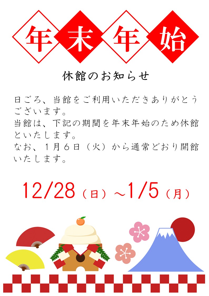 当館は、12月28日(日)~1月5日(月)の間を年末年始のため休館といたします。