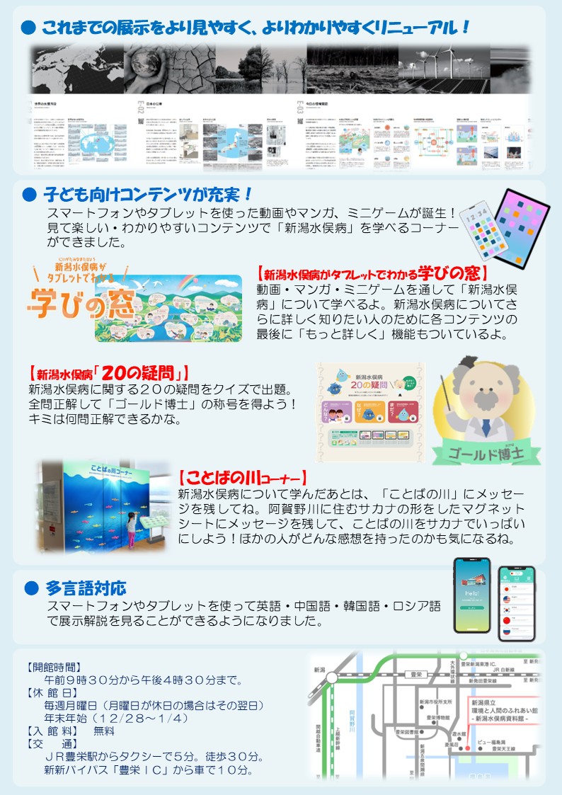 環境と人間のふれあい館の「新潟水俣病」展示室は令和8年2月にリニューアルオープンい